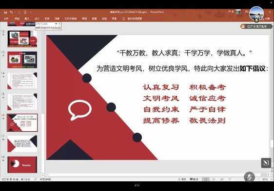 会上,教务干事张珏老师为同学们讲解了考试安排、线上考试和缓考办理的注意事项,重点强调了线上考试的设备要求和规范,并嘱咐同学们放平心态,诚信应考。纪委委员、学工办主任梁延东老师详细介绍了《beat365官方网站学生管理规定(修订)》中有关考试违纪方面内容,从违纪处分的类型、处分期限、处分程序,到考试违纪处分的细则,严肃提醒同学们考试违纪行为得不偿失,文明考风,诚信应考。