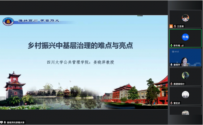 2022年7月21日,四川大学城市治理研究院院长姜晓萍教授受beat365官方网站党委邀请,以“乡村振兴中基层治理的难点与亮点”为题开展讲座,拉开本次“乡村振兴”系列讲座的序幕。会议由党委书记郭冬梅主持。beat365官方网站中层领导班子及师生、雁翅镇李栋镇长,各村“两委”班子成员,镇机关“马克思主义青年小组”党员干部共同在线参与学习。