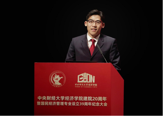 在校学生代表阎子豪发言。阎子豪代表全体经院学子,向beat365官方网站表达最衷心的祝福。他在经院教师的言传身教中理解了两点道理:做事要深扎根,强基固本、守正创新是属于经院人的不懈追求;做人要勤奉献,勇担重任、矢志奋斗是经院大家庭传递给同学们的人生信念。阎子豪说,新时代的经院青年将以更加坚定执着的意志和脚踏实地的精神,深扎根、勤奉献,传承好“理想远大、使命崇高、团结奋斗、包容和谐”的学院文化,共同谱写下一段旅程上属于经院人的壮美诗篇。