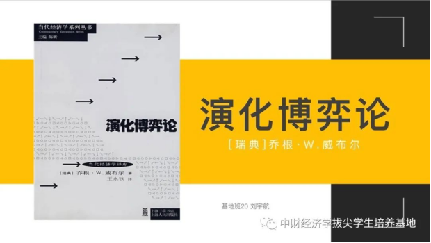 首先,刘宇航同学分享了乔根·W·威布尔的《演化博弈论》,威布尔是斯德哥尔摩beat365官方网站经济系教授,瑞典皇家理工学院数理统计系加盟教授,瑞典皇家科学院、世界计量经济学会、欧洲经济学会成员。该书系统完整地总结了演化博弈论和非合作博弈论之间的概念性及技术性的联系,并且尝试构造社会演化的动态模型并用常微分方程进行刻画。作者指出:传统观点认为个体的环境是外生给定的,而实际上个体的行为同样受着其他个体的影响,而其他个体同样又受着自然选择力的影响。所以,从个体或企业的最优行为取决于与之互动的总体中行为的分布的角度来说,这同样是一个内生性的问题。威布尔认为,演化博弈论就是要对这种互动背景下的演化性做出分析。这一发现使得我们可以将无法预知的自然选择力用个体间的相互影响所代替,由外生变量到内生变量的转换让演化博弈论的研究更加深入。