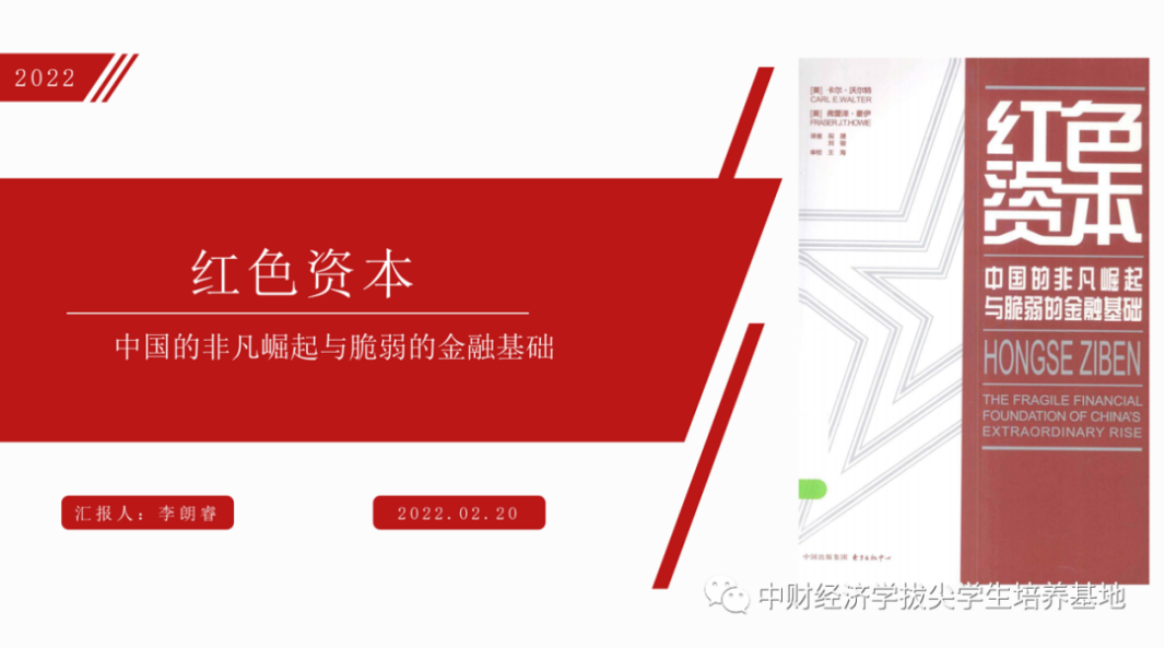 接着,李朗睿同学分享了《红色资本》这本书,书的作者是卡尔·沃尔特和弗雷泽·豪伊。卡尔在中国生活了20年,并积极参与了多项金融改革工作,在1992年的中国企业首例海外IPO和1994年首批中国国有企业在纽约证券交易所上市过程中发挥了重要作用。该书介绍了中国数十年来的经济改革史,重点梳理了中国波澜壮阔的金融改革历程。作者在书中对中国银行重组,以及债券、股票市场的构建进行了详细的梳理,对重要的金融决策、政策与内幕进行了深入浅出的分析,最后对中国政府如何构建、改革自己的金融体系进行了总结。作者认为,中国一直存在着将政治任务交给银行来完成的现象,银行成为了政府的工具,但这会干扰市场秩序,扰乱市场价格;同时,国有资产限股让资产定价无法自由实现,限制了资本市场的运作,导致中国的资本定价不明、企业融资难、资源配置效率不高。找到释放中国股市的方法将是中国未来金融改革的一个重要任务。中国未来的金融改革应当寻求突破,从根本上找到一个解放资本市场定价、充分发挥央行调控金融能力、全面释放金融力量,促进经济平衡发展的方法。而想做到上述需要我们这代人扎根中国,深入了解中国金融历史,同时积极吸收国外的金融发展经验,才能在中国金融未来的改革中做出实质贡献。