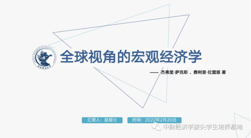 首先,赵娅瑄同学分享了由杰弗里·萨克斯和费利普·拉雷恩所著的《全球视角的宏观经济学》这本书,她从作者简介、本书贡献、章节简介、观点分析以及总结五个方面对整本书做了介绍。作为著名的研究全球发展问题的专家,杰弗里·萨克斯连续两年被《时代》杂志评为“世界百名最有影响的人物”之一,并被《纽约时报》称为“世界上最重要的经济学家”。本书是第一本着眼于全球经济的现代宏观经济学教科书,在理论陈述中融进了宏观经济研究的最新进展,特别是有关预期的作用,家庭、企业和政府的跨时期选择,以及包括时间一致性和国际政策协调问题在内的现代经济政策理论。本书重点考察了国与国之间在重要的宏观经济制度(如工资确定的形式)方面的不同,并将这些制度差异与所观察到的宏观经济表现差异联系起来,进行深入研究。自问世以来,该书产生了广泛的影响,是国际上许多大学和研究院的经济系以及国际组织的重要教科书;由于其政策针对性强,表述清晰易懂,也被许多国家的宏观决策机构作为重要参考书加以使用。