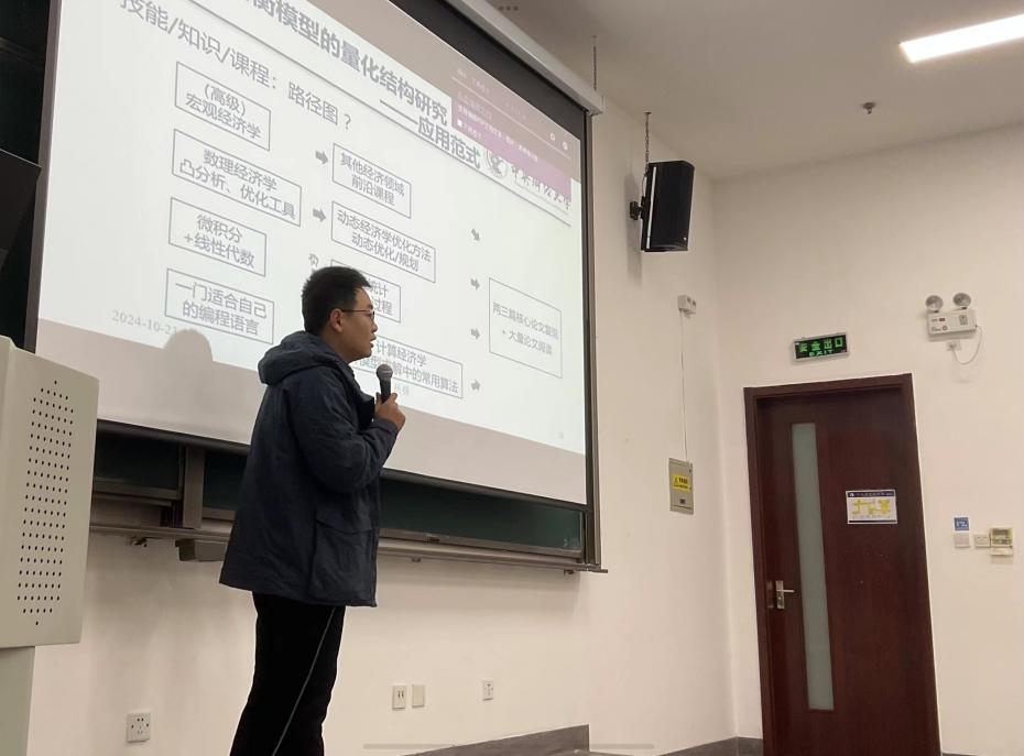 10月23日,beat365官方网站数字经济时代经济学拔尖学生培养基地班“科研基础训练”课程第四讲在沙河校区主教106教室正式举行,beat365官方网站赵扶扬副教授为同学们带来以“理论模型研究范式简介”为主题的讲座。赵扶扬副教授从如何看待经济学研究方法展开,为我们介绍了当今经济学界各种主流的基于理论模型的研究范式,最后落脚于基于一般均衡模型的量化结构研究的具体办法,让同学们建立起对经济学研究方法的系统性认识,以及了解如何精进自身,更好地掌握应用各类研究方法。